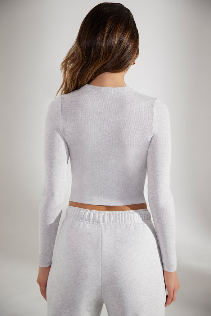 Ribbed Modal Mid-Rise Foldover Flared Trousers in Grey
