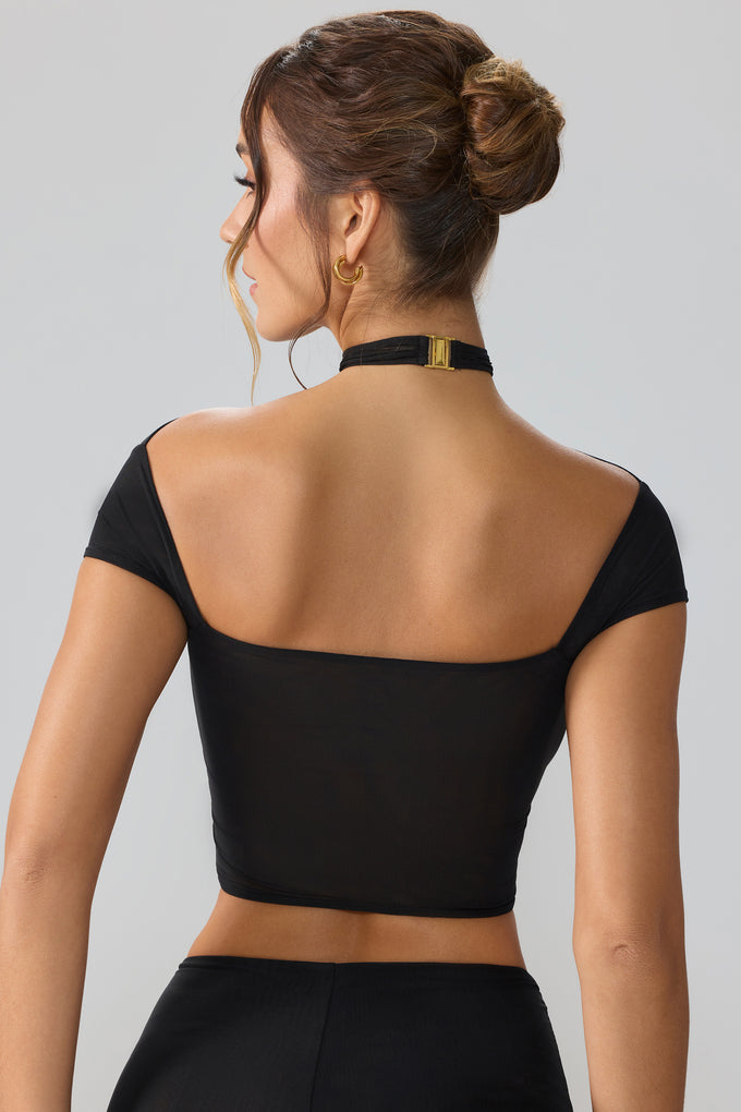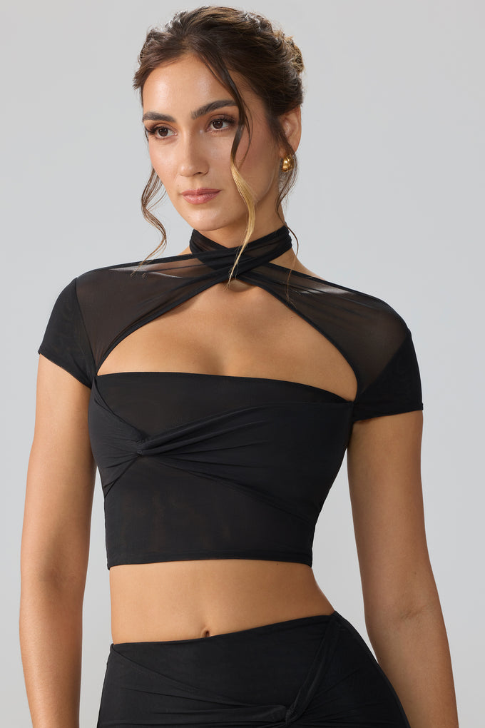 Embellished Peekaboo Cowl-Neck Top in Black Armelia