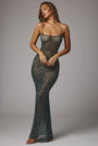Customers say this dress fits like a glove and hugs curves beautifully. Many note its stretchy, form-fitting silhouette and sparkling embellishments that catch the light. The dress tends to run long, with shorter customers needing heels. Reviews mention the sheer fabric, with most opting to wear undergarments beneath. The gown draws frequent compliments at special events.