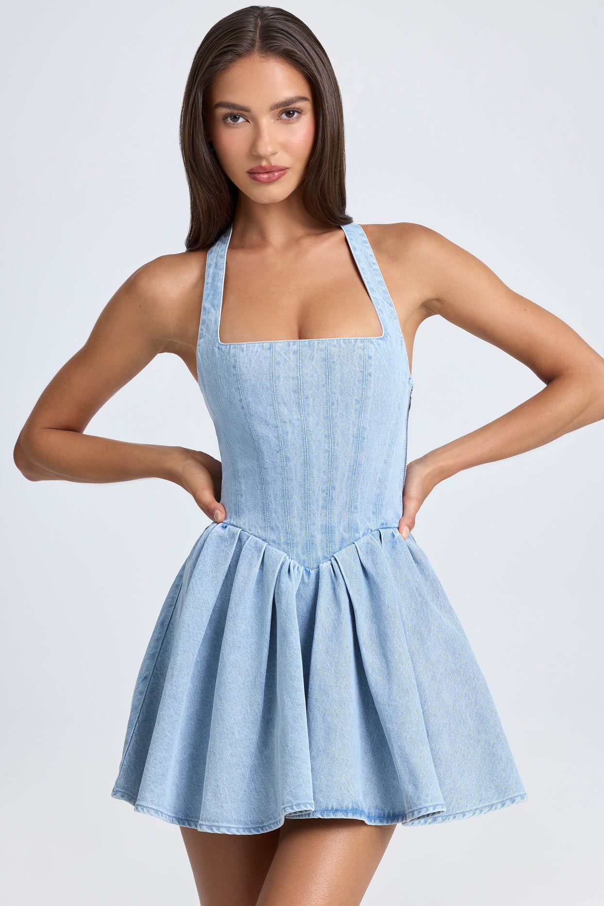 • Halterneck Corset Micro Mini Dress in Light Blue Stonewash