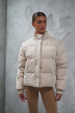 • Cropped Puffer Jacket with Detachable Sleeves in Sand