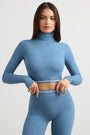 • Backless Turtleneck Long-Sleeve Crop Top in Steel Blue