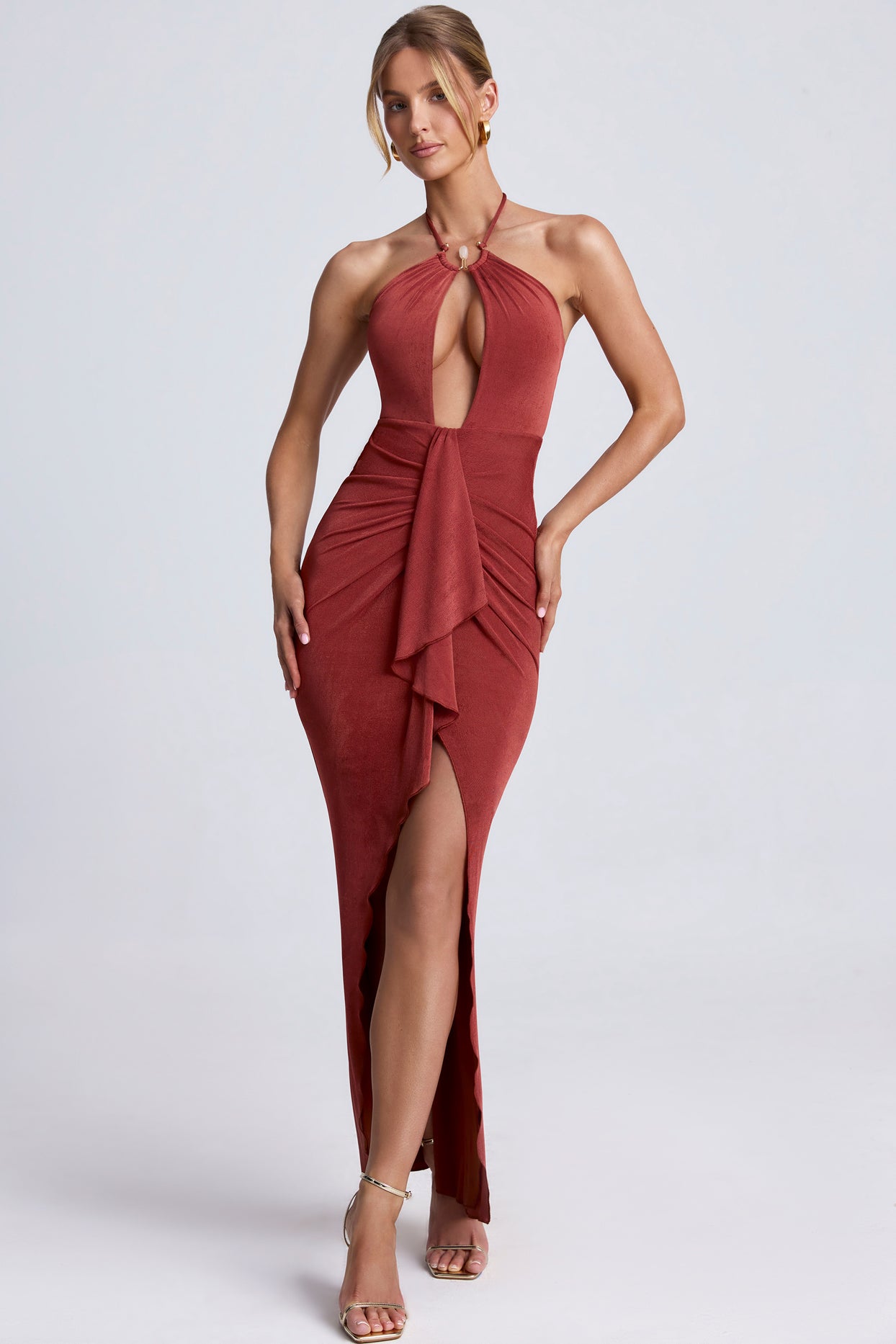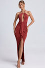 • Hardware Detail Cut-Out Halterneck Maxi Dress in Auburn Brown