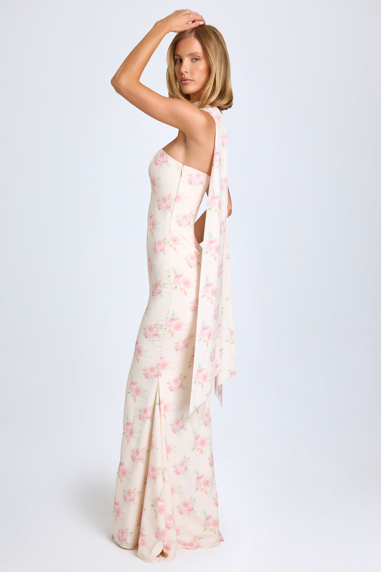Scarf-Detail Strapless Gown in Large Rose Print