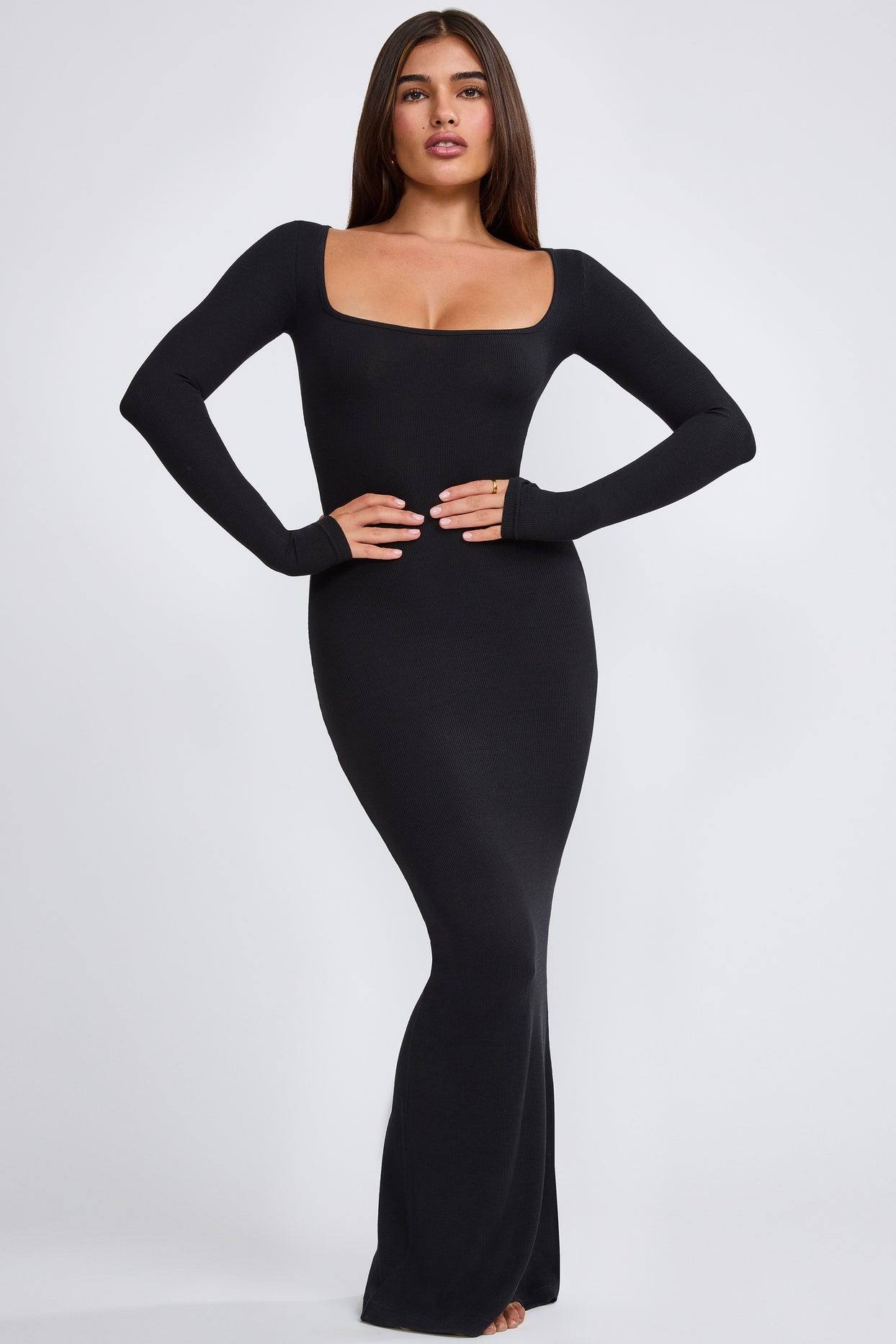 • Ribbed Modal Long Sleeve Maxi Dress in Black