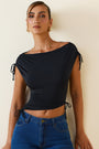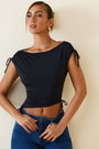 Asymmetric Ruched Cowl-Back Crop Top in Black