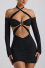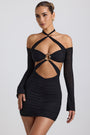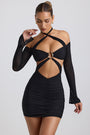• Off-Shoulder Ruched Cut-Out Mini Dress in Black