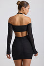 Off-Shoulder Ruched Cut-Out Mini Dress in Black