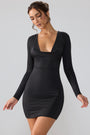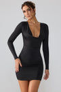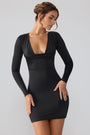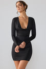 • Slinky Jersey Long Sleeve Plunge Neck Mini Dress in Black
