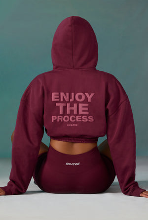 • Cotton Fleece Drawstring Cropped Hoodie in Plum